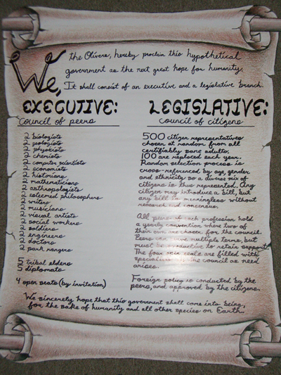 ![]() WE, the Olivers, hereby proclaim this hypothetical government as the next great hope for humanity. It shall consist of an executive and a legislative branch. EXECUTIVE: Council of peers --------------------------- 2 biologists 2 geologists 2 physicists 2 chemists 2 computer scientists 2 economists 2 historians 2 mathematicians 2 anthropologists 2 esteemed philosophers 2 writers 2 musicians 2 visual artists 2 social workers 2 soldiers 2 engineers 2 doctors 2 park rangers 5 tribal elders 5 diplomats 4 open seats (by invitation) LEGISLATIVE: Council of citizens -------------------------------- 500 citizen representatives chosenat random from all certifiably saneadults. 100 are replaced each year. Random selection process is cross-referenced by age, gender and ethnicity so a diverse mix of citizensis thus represented. Any citizen may introduce a bill, but any bill is meaningless without research and consensus. All peers of each profession hold a yearly convention where two of their own are chosen for the council. Peers can servemultiple terms, but must be productive to maintain support. The four open seats are filled with specialists by the council as need arises (global warming, space race, depression etc). Foreign policy is conducted by the peers,and approved by the citizens. WE sincerely hope that this government shall come into being, for the sake of humanity and all other species on Earth. |