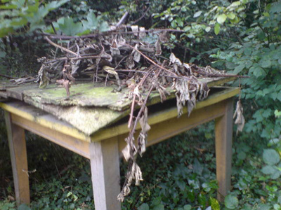 Find an old chair or table or other piece of furniture that has become dilapidated beyond the point of repair. It should have already begun its return journey, back into nature, any hardware having been lost long ago, and its wood already crumbling, brittle or on the verge of decay. Hasten this process by placing it out of doors, in an unsheltered space where wind and rain can wreak their havoc on its artifice, dismantle its fabric. Encourage birds and insects to frequent it by scattering seeds and rotting boughs about it, and allow filth, or rather grime, organic, but not putrescent, to gather on its surfaces and in its folds.